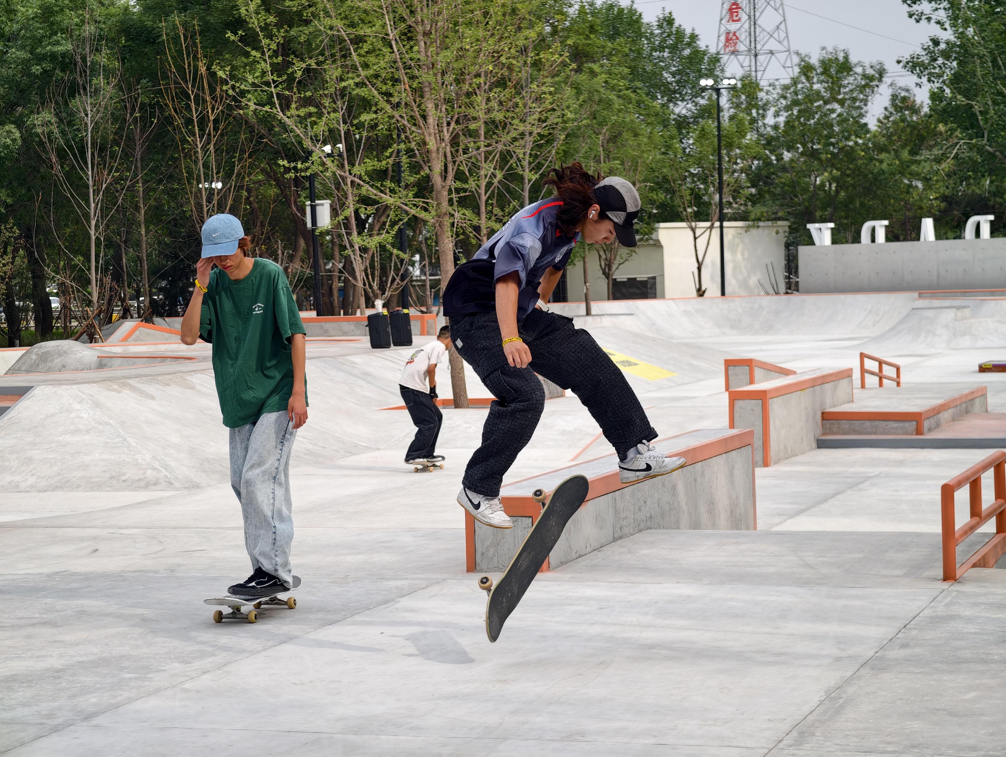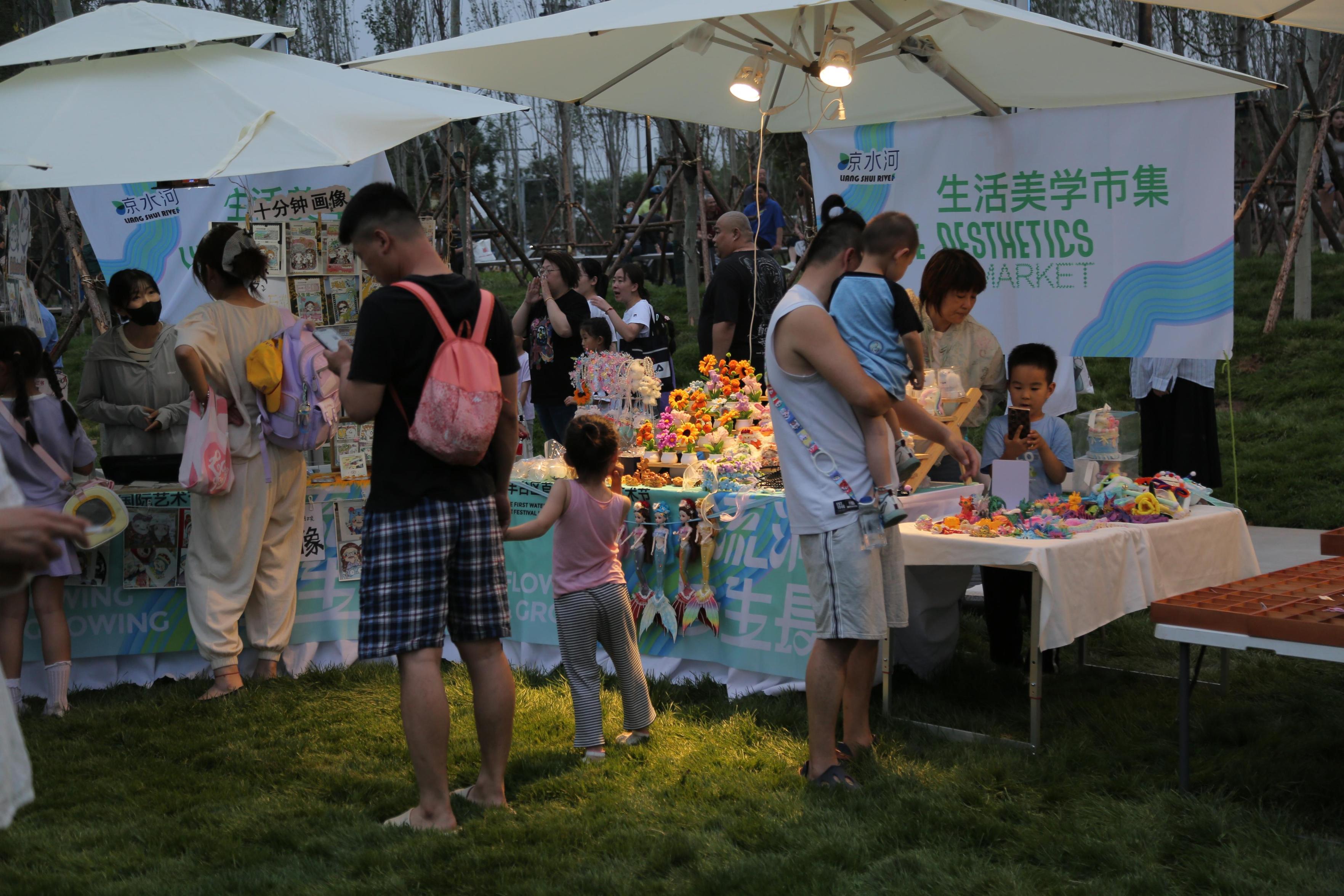 河水静静流淌,绿树成荫的河畔形成了一个多元化的艺术空间,在夜晚呈现出与白日截然有异的千里浸式体验。滑板区传来后生滑手的尖叫喝彩,献技着街头文化的热血对决;不远方的林间旷地,亲子家庭围坐在画布旁,随着艺术家学惯用当然素材创作肌理画,孩子们举着树叶拓印的“作品”奔波得意,一幕幕幸福的镜头在此定格。
