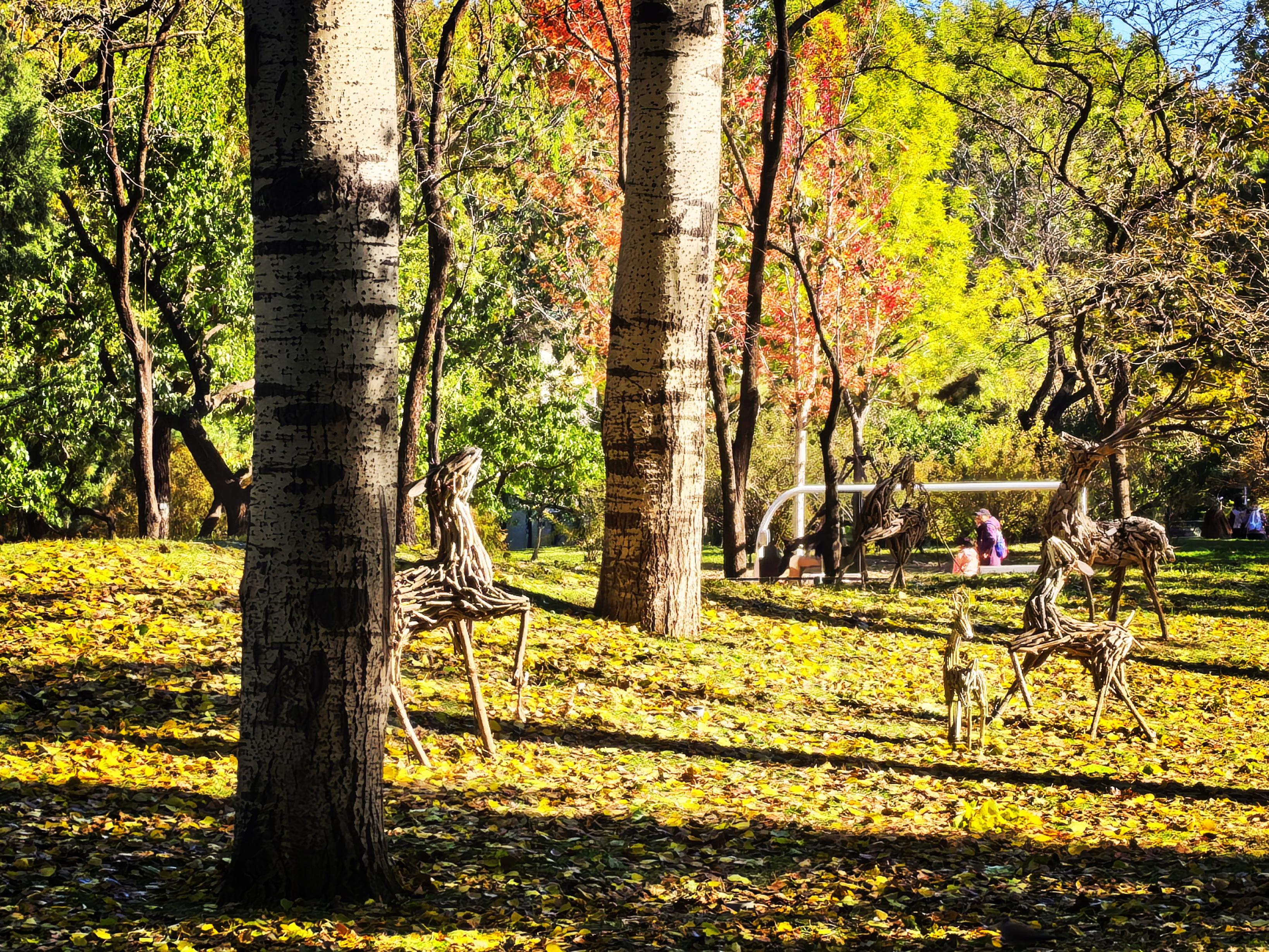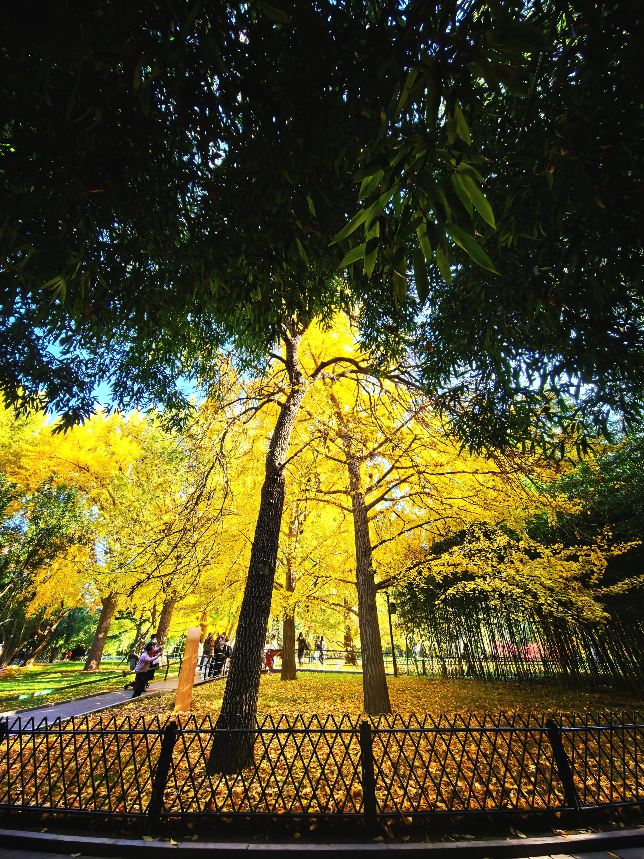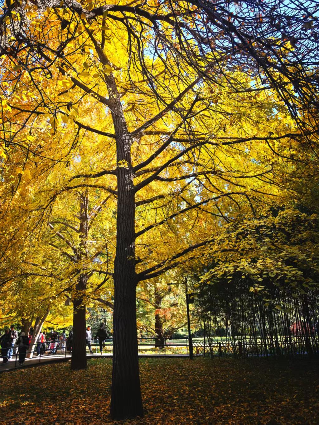 北京动物园西园,金色的树叶铺满地面。
