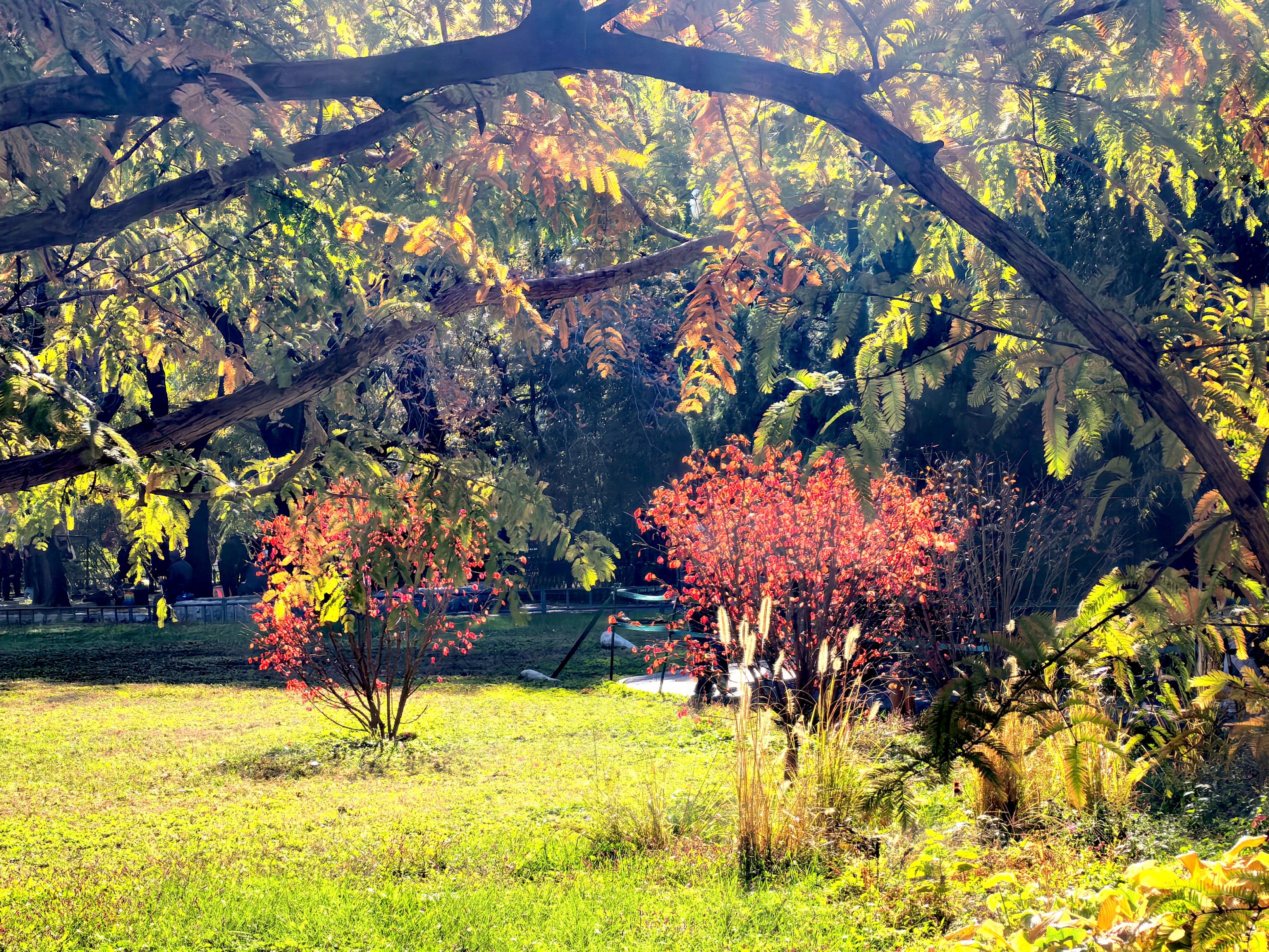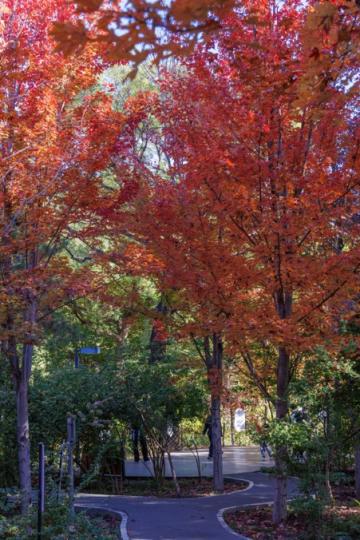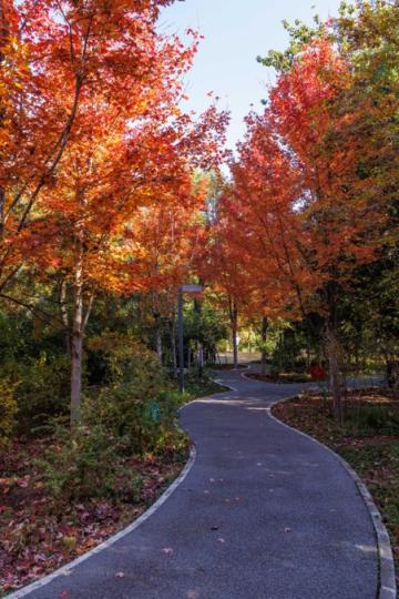 广阳谷城市丛林公园的红叶步说念,静谧幽森。