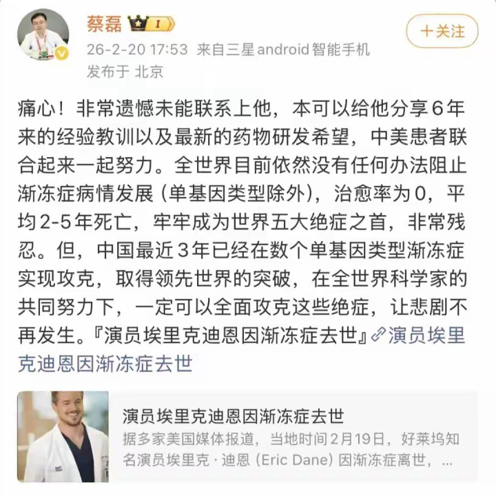 这亦然为什么,20日下昼,国内渐冻症患者、京东前副总裁蔡磊会发声说愁肠,并缺憾没能商量上他,思把我方多年与病共处、参与药物研发的领导共享出去,号令中好意思患者通盘尽力。