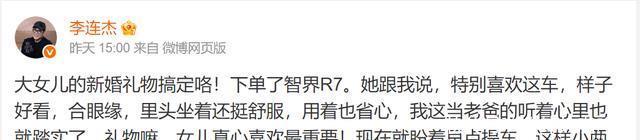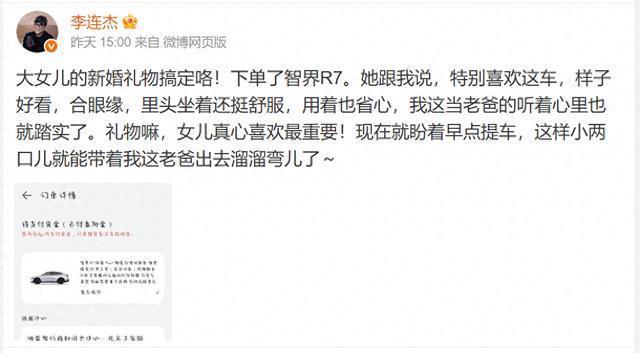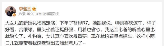 但在李连杰的笔墨里,莫得一句在祝女儿李念念新婚幸福,反而提及我方要送女儿一辆国产车。 通篇下来一直在说车有多好,女儿多喜欢这辆价值30万控制的某品牌国产车, 也不知谈李连杰这是在为女儿准备成婚典物,照旧在打告白。