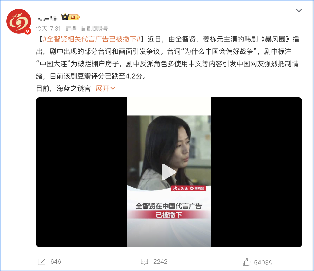 当今这部电视剧的集结评分一经掉到了4.2分,我推测这个分数还会无间降,全智贤此次“复出”,也算是澈底封死了我方在中国的路。