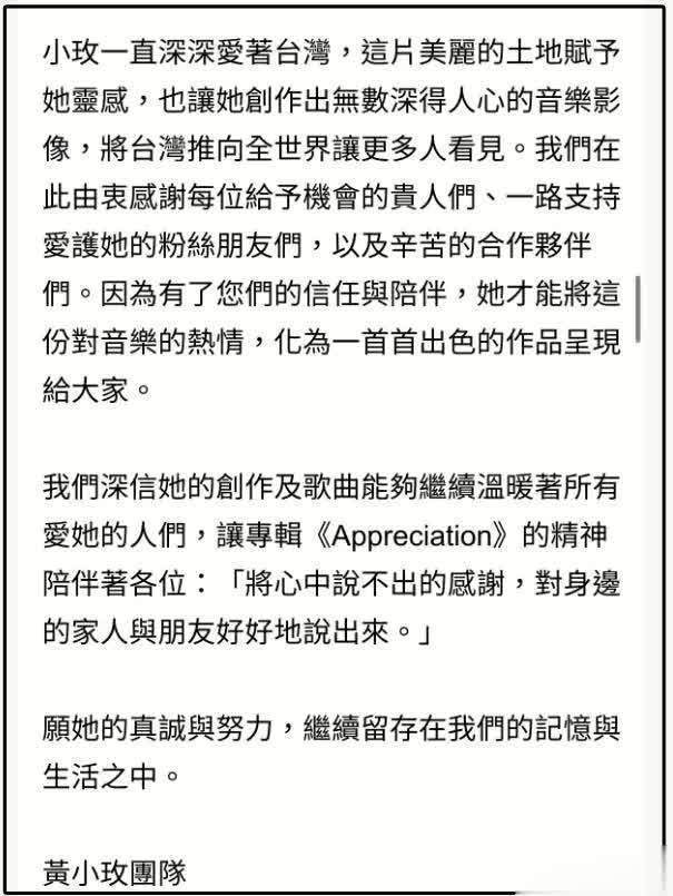 黄小玫的团队发布公告证明了这一噩讯,称她已化作最顺心的天神。