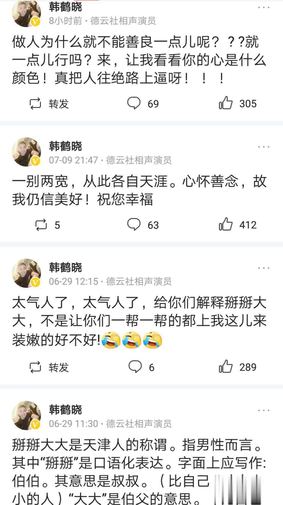 上图是韩鹤晓最近一段时候所发的微博,博文的字里行间似乎有着怨气,但究竟发生了什么事,他朦拢其辞的言语一时之间让吃瓜专家迷迷糊糊!