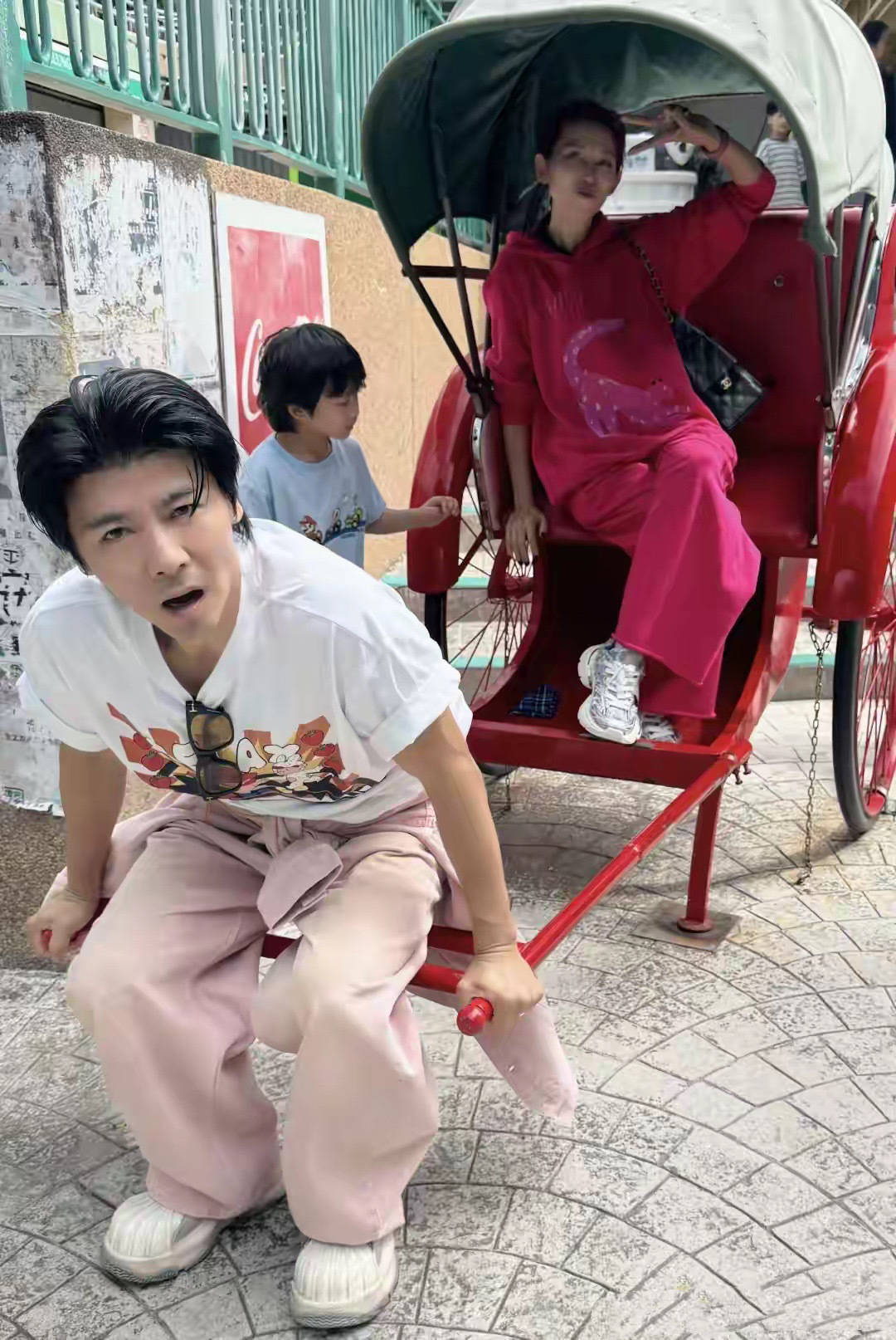 尽管张晋体格不太好了,但为了陪妻子女儿玩得欢跃,照旧特别卖力。蔡少芬坐在一辆红色的小洋车上,张晋充任起“车夫”。