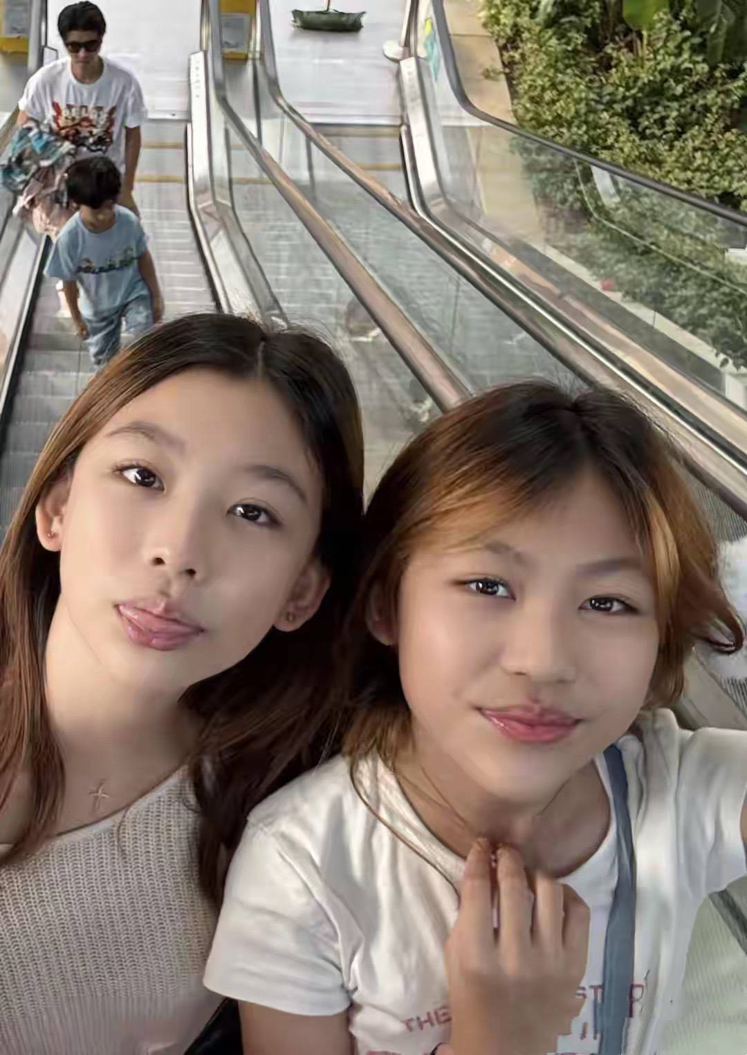 竟然是女大十八变越变越悦目,蔡少芬的两个女儿几乎长成了姆妈翻版。她们都染着黄色头发,还化了淡妆,有一种比拟锻练的嗅觉。