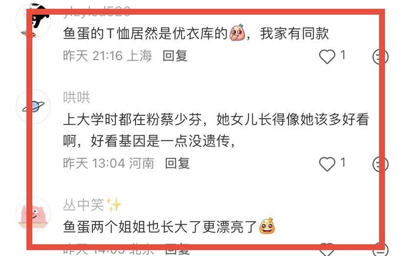 还有网友发现,鱼蛋的T恤竟然是优衣库的。自然蔡少芬和张晋都是大明星,但对一家东说念主都很接地气,穿着打扮都很亲民,鱼蛋穿优衣库的T恤,也不追求外洋大牌。