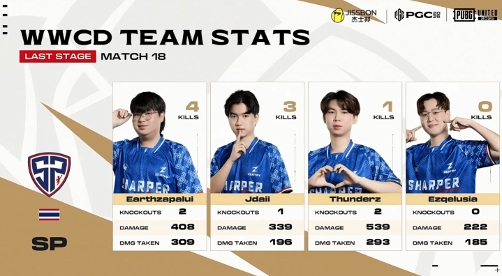 阶段8至梅花桩剩余3队,17领先打掉FUR一东谈主,但我方被打倒一东谈主扶起后,点火弹被敌手打爆,导致两东谈主倒地,随后SP前压打掉17剩余2东谈主,FUR独狼则是1换1后被淘汰,SP吃鸡。