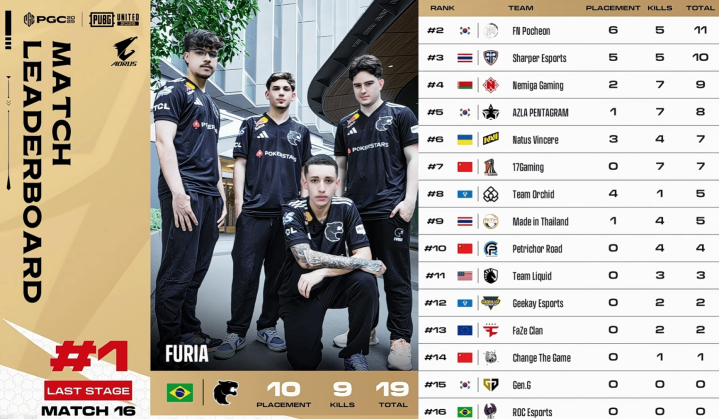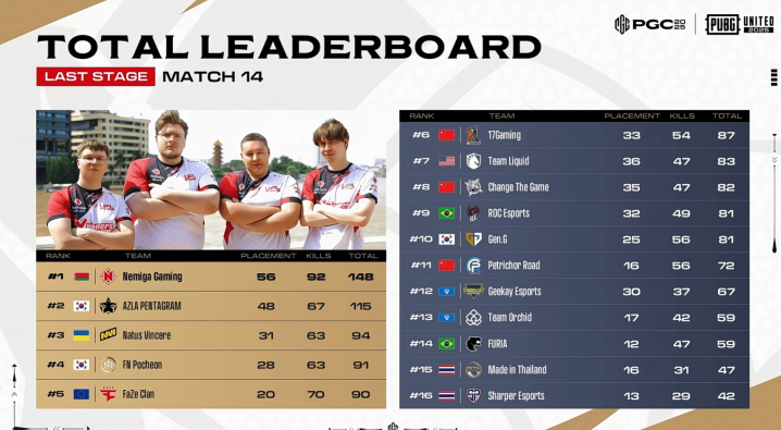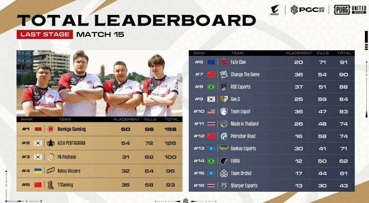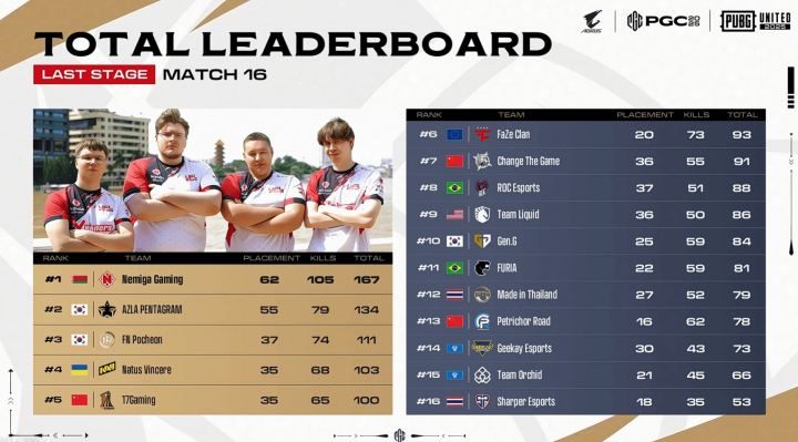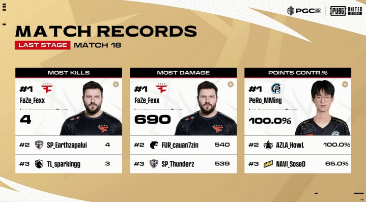 阶段6剩余7队,FAZE遑急PeRo3东谈主编制房区失败被团灭。ROC4清2NMG,关联词反而被团灭,NMG独狼最终被PeRo淘汰,但PeRo也被GEN打掉1东谈主。