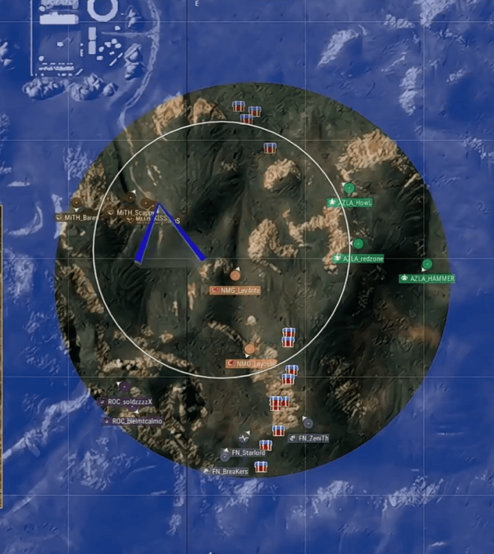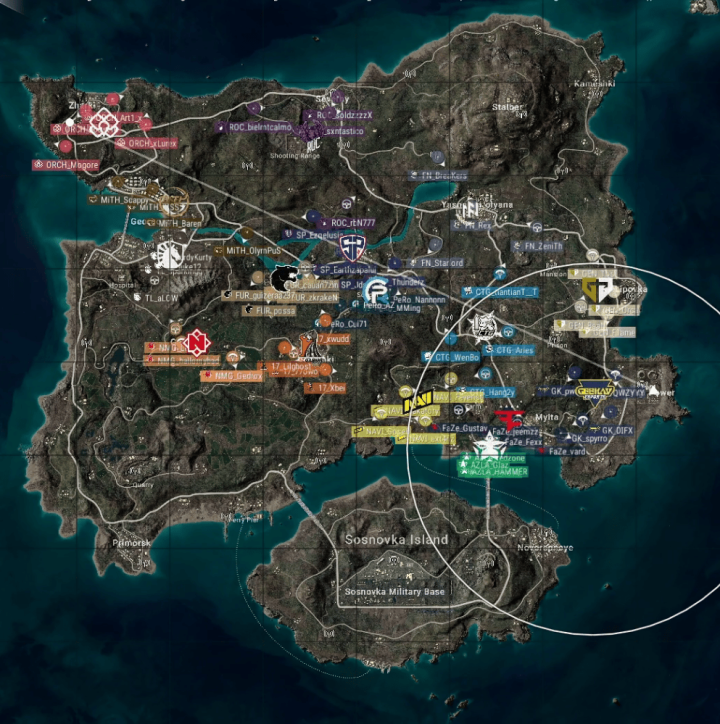 本局决赛圈位于左上小岛军事基地南侧反坡。