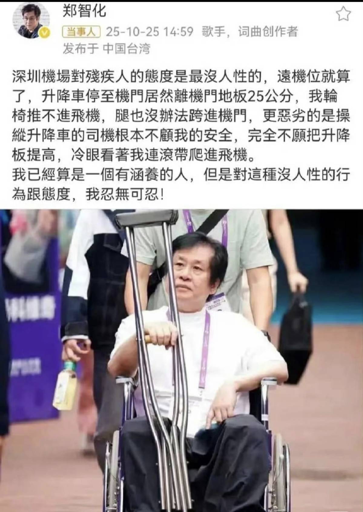 10月25日,台湾歌手郑智化在支吾媒体发文,痛陈我方在深圳机场乘坐深航航班时碰到的尴尬:升降车与机舱门之间25厘米的高度差,让他这个坐了几十年轮椅的东谈主不得不“片甲不留”登机。这条带着盛怒情感的帖子赶快引爆网罗,驳斥区里尽是对机场就业的质疑——“无任意通谈难谈仅仅摆列?”“连基本的东谈主文柔和王人作念不到吗?”