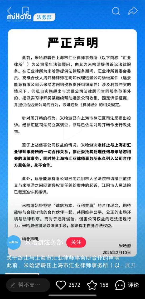 鉴于上述侵害公司权利的情况,米哈游决定隔断与上海市汇业讼师事务所的一切配合相关,住手托福其惩办任何与米哈游有关的法律事务,同期将上海市汇业讼师事务所遥远列入公司配合方黑名单,永不对作。