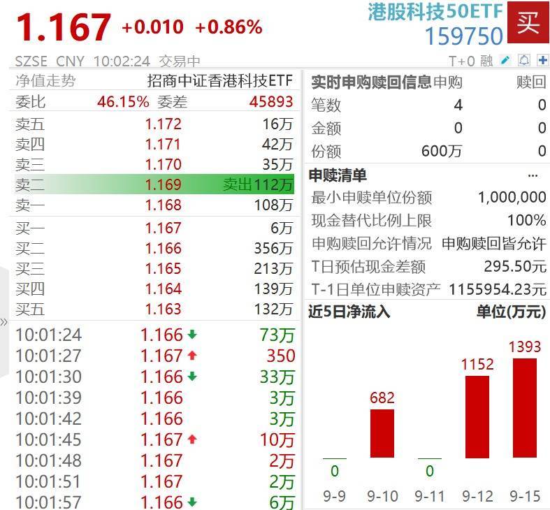 港股科技50ETF(159750)涨0.86%,Wind及时申购赎回音息数据败露,早盘获净申购超600万份。